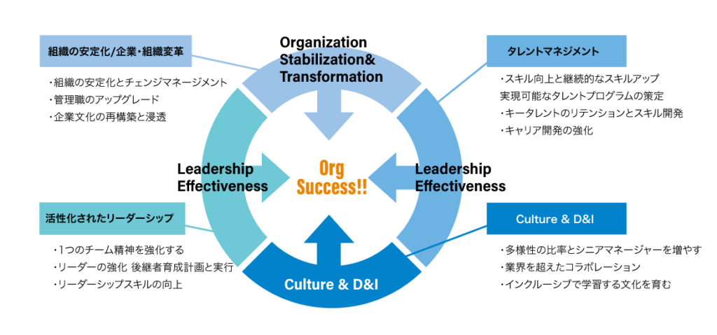 また、経営戦略に沿ったリーダーシップの開発を通じて、組織全体のビジョンと戦略の達成を支援します。
